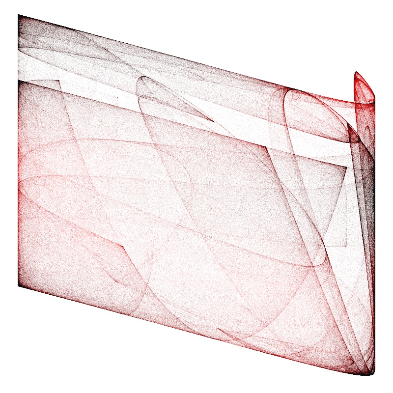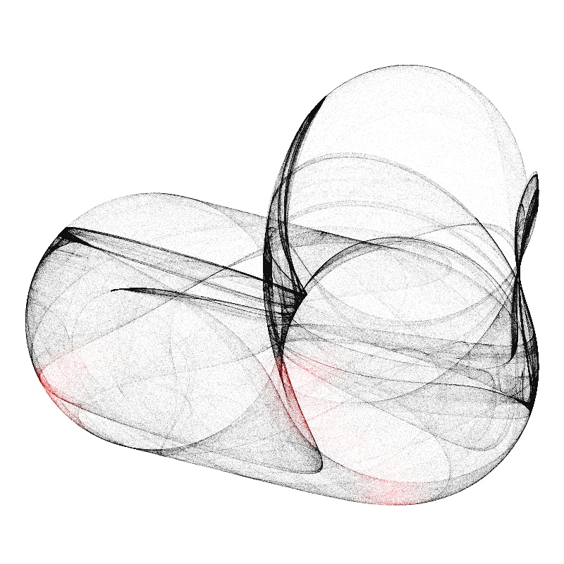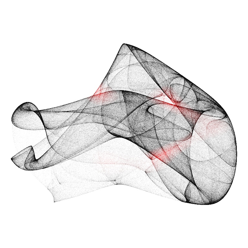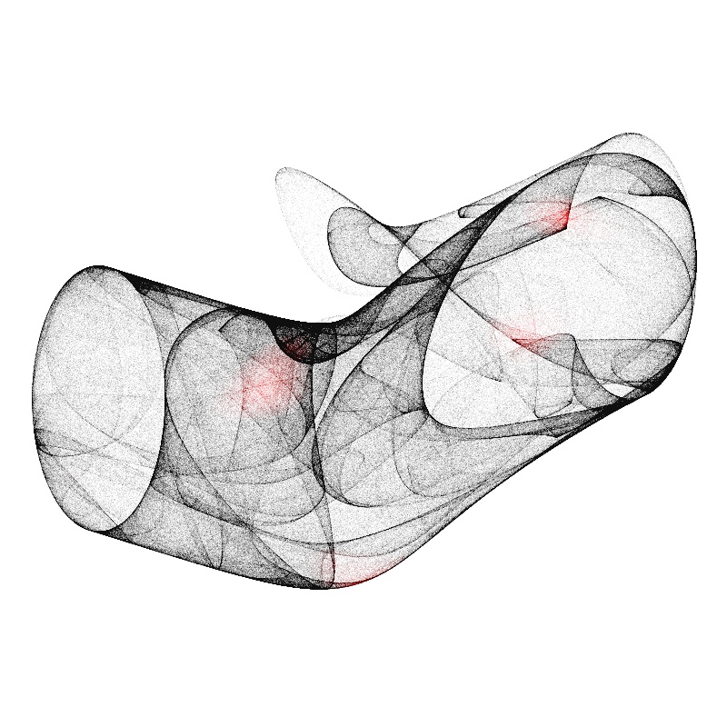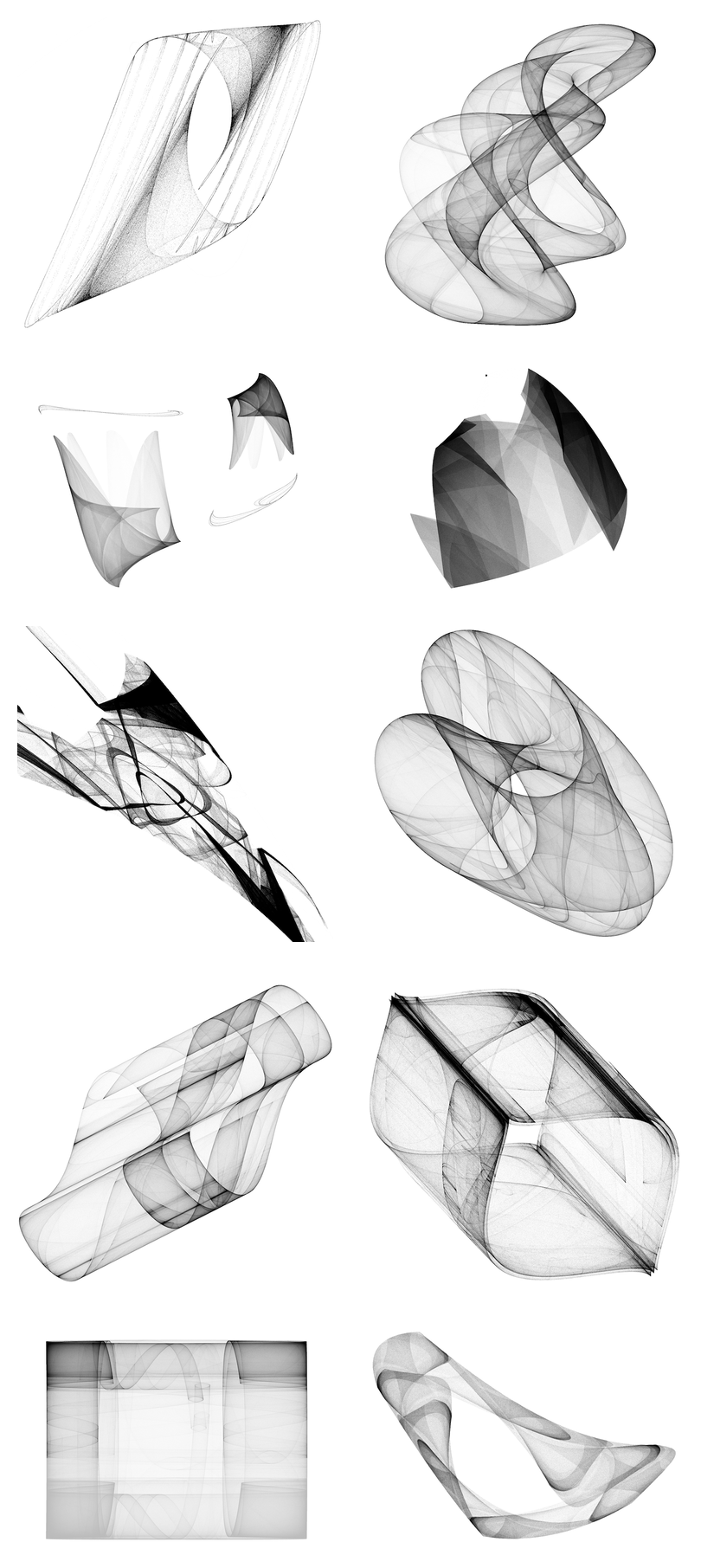 $$ \begin{aligned} x_{n+1} = \sin(a\,y_n) - z_n \cos(b\,x_n) \\ y_{n+1} = \sin(b\,z_n) - x_n \cos(c\,y_n) \\ z_{n+1} = \sin(c\,x_n) - y_n \cos(a\,z_n) \end{aligned} \label{eq:clifford_3d} $$This is the system I played with the most. Here’s some of my original image generations from around 20 years ago: