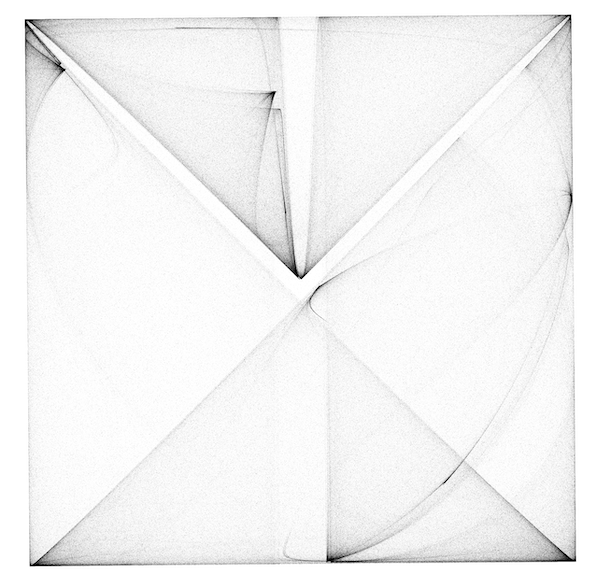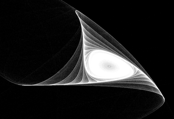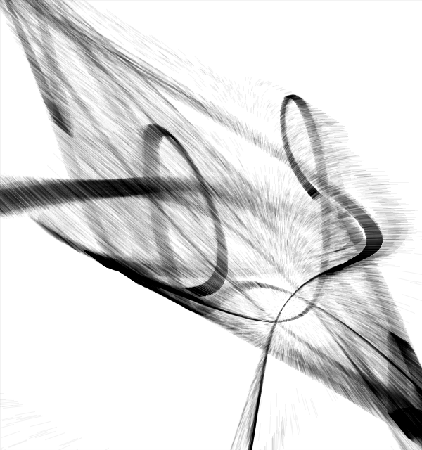 $$ \begin{aligned} x_{n+1} &= \sin(a\,y_n) + c \cos(a\,x_n) \\ y_{n+1} &= \sin(b\,x_n) + d \cos(b\,y_n) \end{aligned} \label{eq:clifford_classic} $$To plot this MPS: choose some parameters \( a \), \( b \), \( c \), \( d \) (which dictates the shape), and a starting point for \( (x_0, y_0) \),2 and iterate the equation many times. We leave a faint mark on the pixels we visit as we go, building up the shape.
