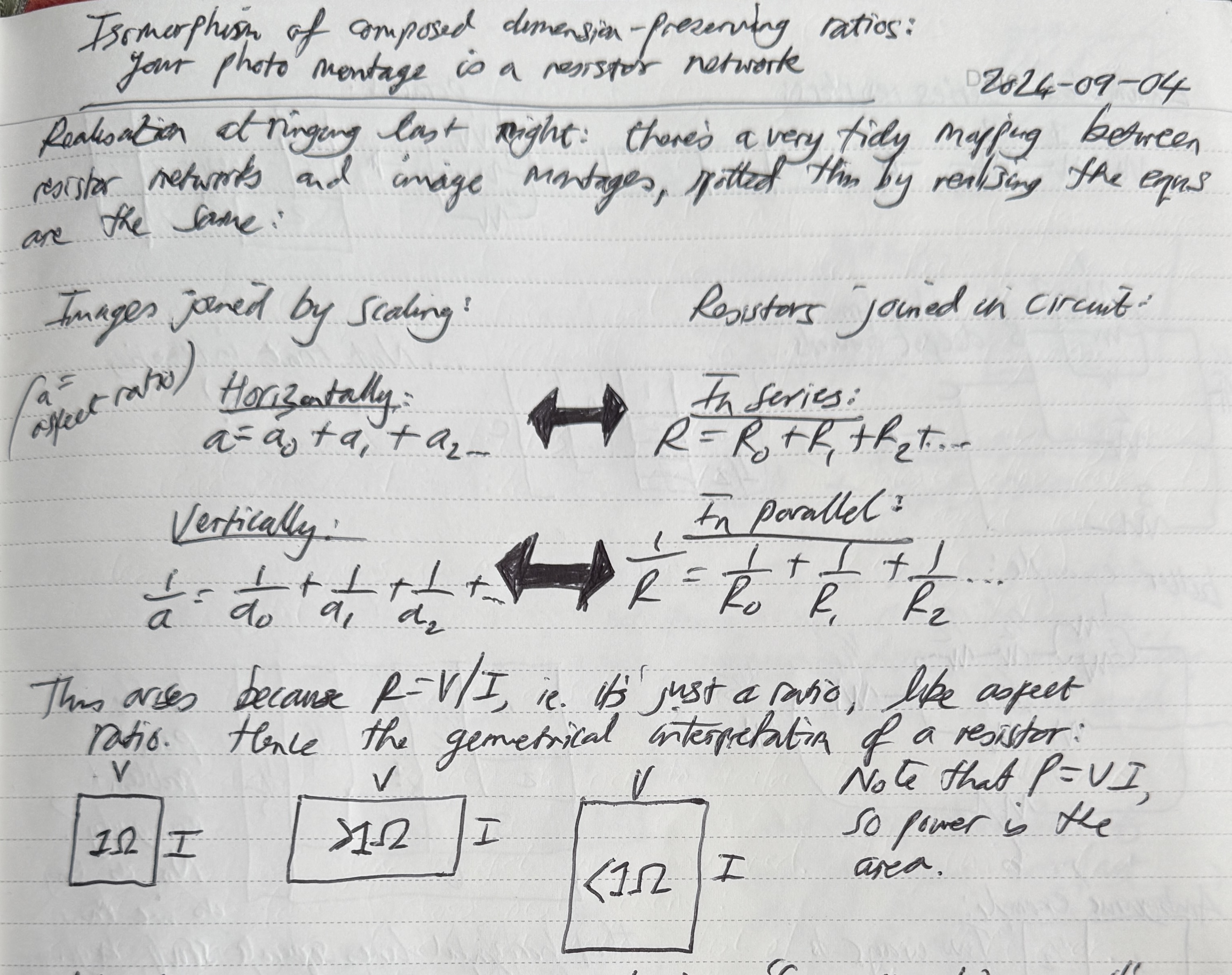 Walkabout is my expression for when I’m thinking about one thing and then I go off in some other interesting direction or I try to generalise something. The original ohmap idea is a good example: I was just sketching some trivial code for building image montages, and I later spotted the simple mapping to resistor networks.