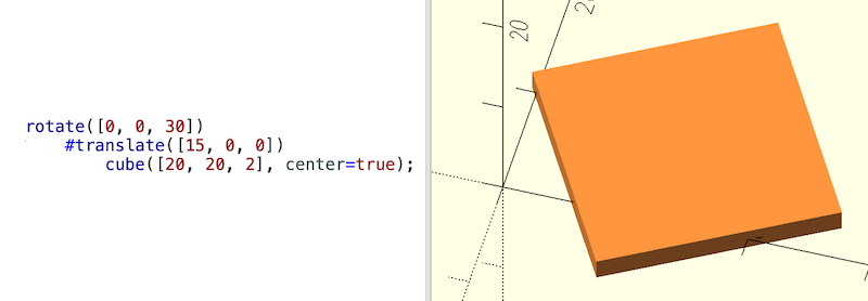 If we put a # in front of the translate, the object looks different, but it’s in the same place and orientation: